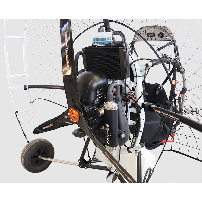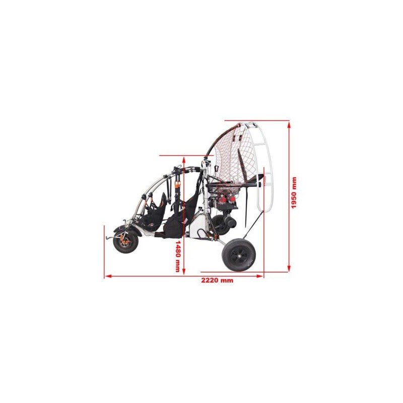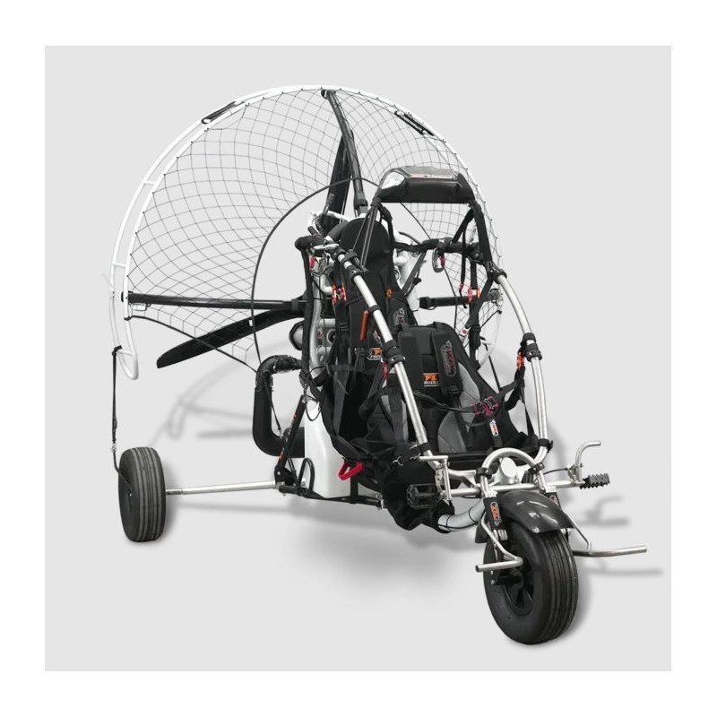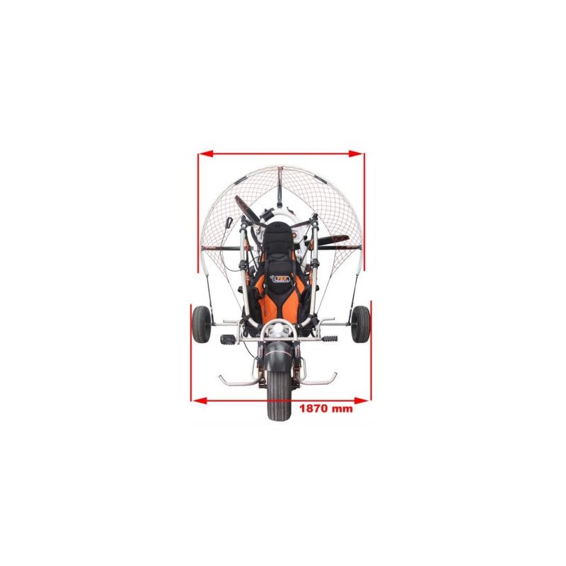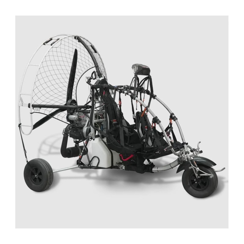 The shock absorber system is made up in the rear by two flexible ergal bars and the front wheel is equipped with our E.T.C. elastic system. The center of gravity has been lowered increasing stability in takeoff and landing. The wing connection point is on the same attachment point as the pilot’s harness and on the same axis as the tank for this reason it remains very stable even in turbulent conditions. The pilot positioned behind the passenger, in direct and visual contact with the glider maintains control in all phases of flight. The attention paid to all these details makes this a safe, fun and user-friendly craft.