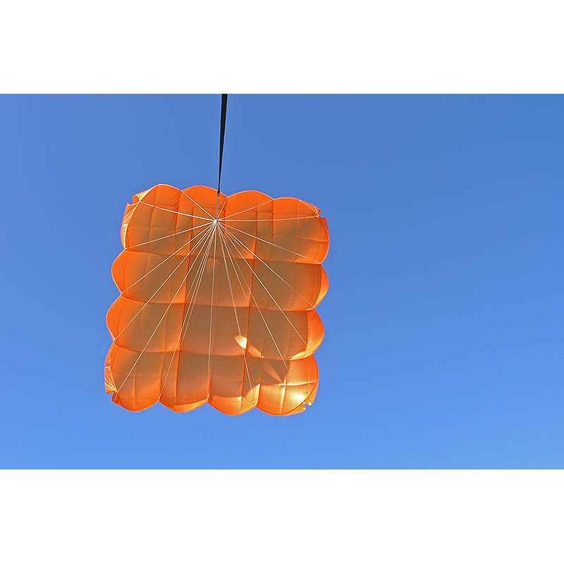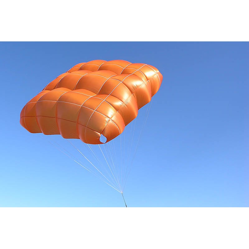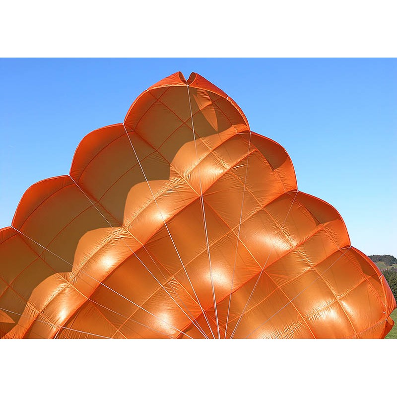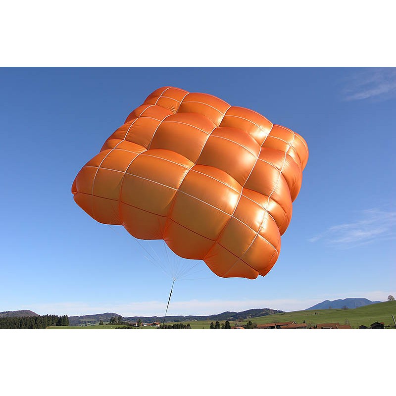 A large projected system surface, precisely calculated suspension points for the painters maximise the projected surface and achieved a reduction of the parachute's sink rate. Defined outlet ports at each corner as well as a slightly asymmetric canopy, led to even lower sink rates and provided outstanding pendulum stability. Due to these innovations, we were able to stay even below a required sink rate of 5,5 m/s according to EN 12491 restrictions - during certification tests we stayed up to 15% below that threshold.