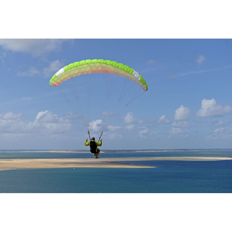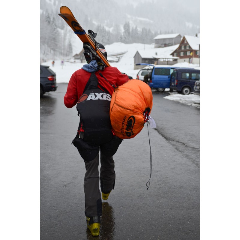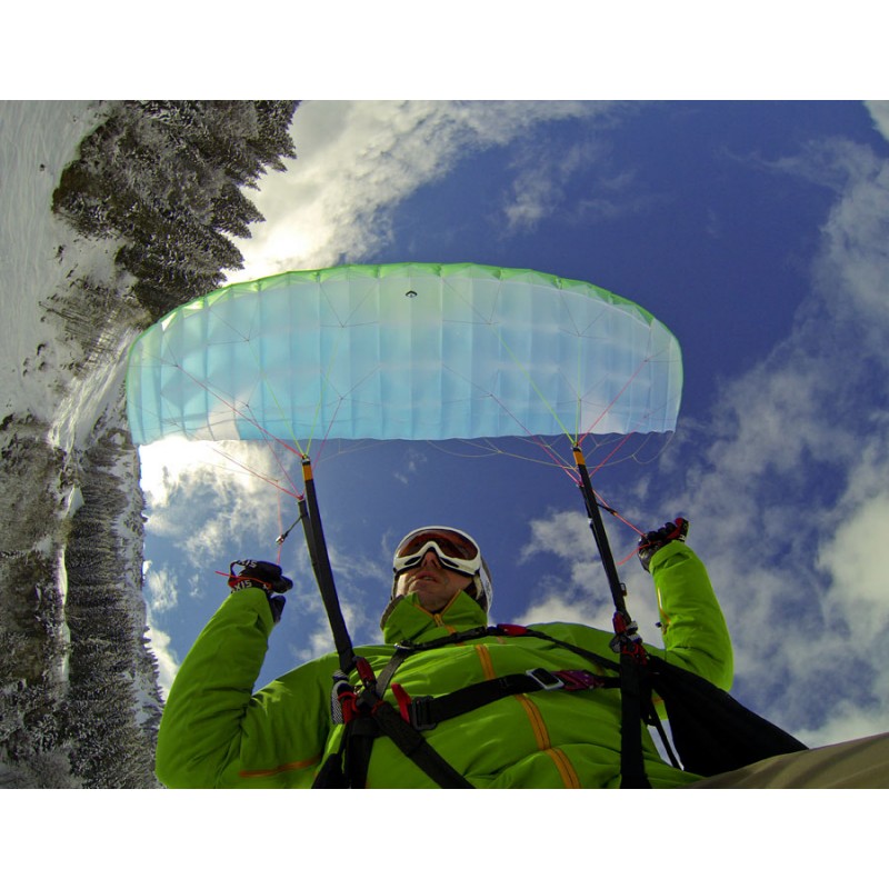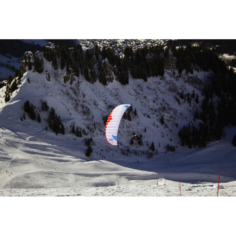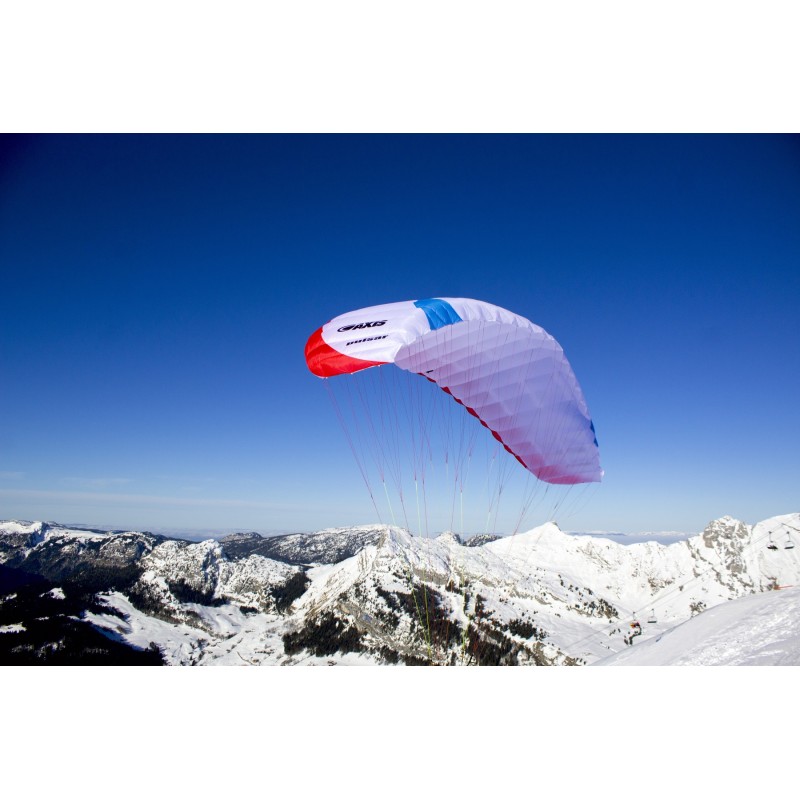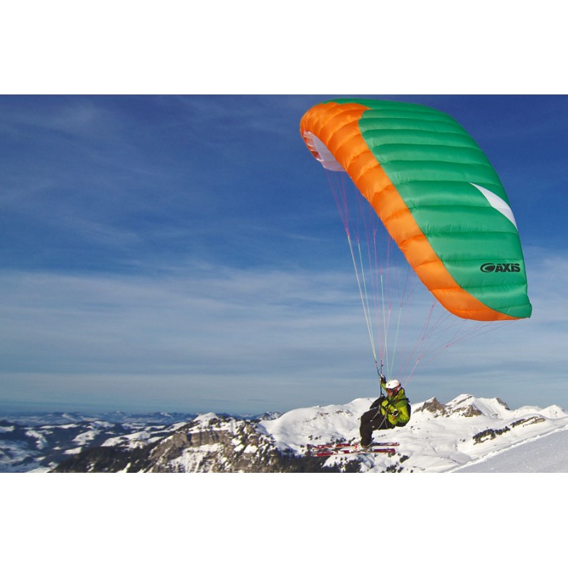 All lines are sheeted to be protected from the sharp ski edges. In combination with a moderate trimmer, it is the perfect beginner speedflyer to ride on skies. Trimmed down it has a nice uplift for foot launch, trimmed up it delivers a very nice and controllable dive for touch and go with skis. The top notch flare characteristics are typical for an Axis glider.